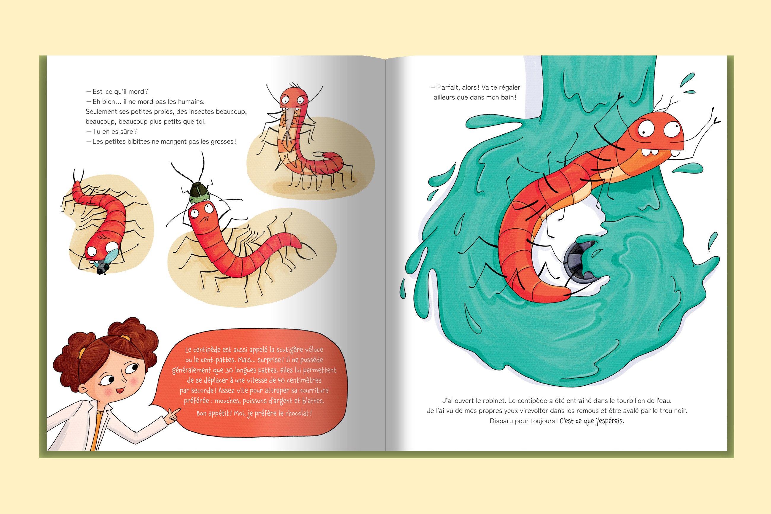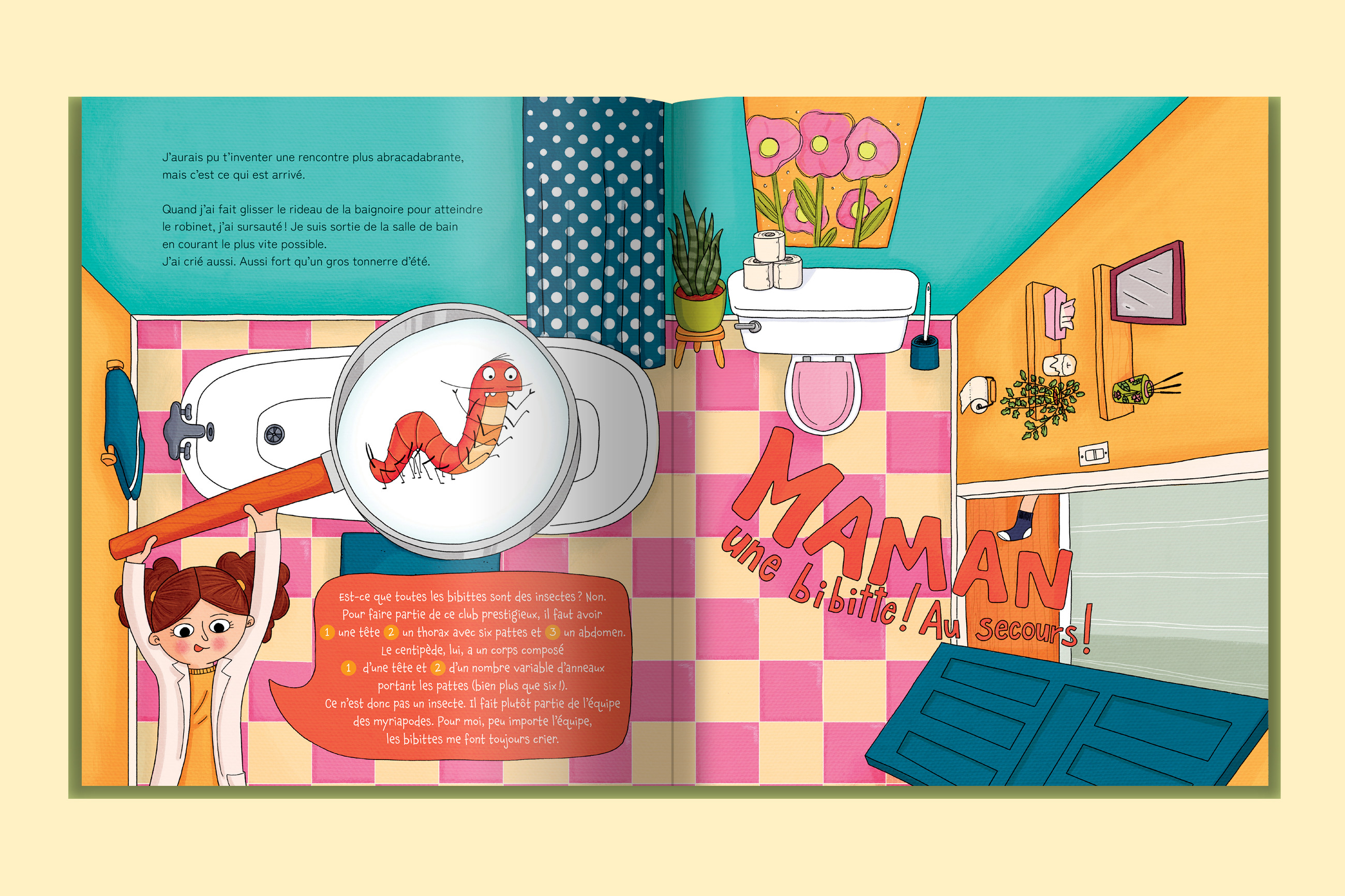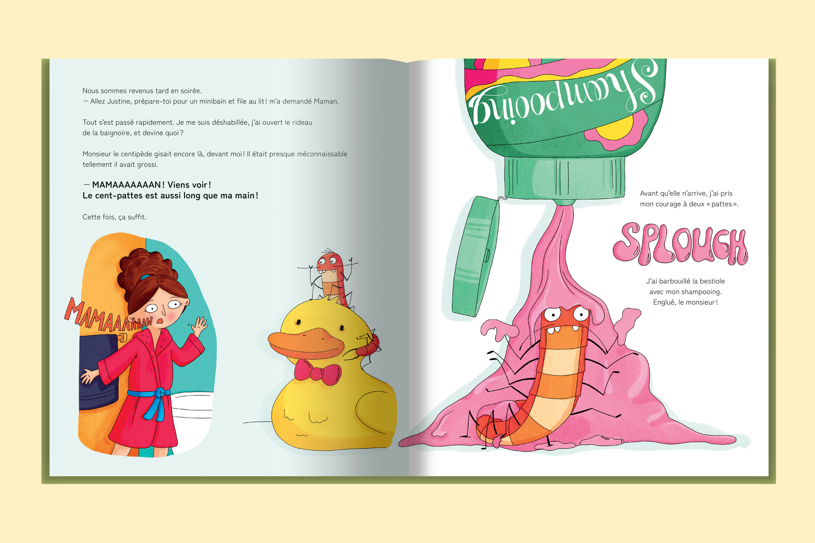 Un centipède dans ma baignoire, de Edith Lacroix et illustré par Stephanie Mackay, Bayard Canada, 2025. Mise en page de l'album (couverture et intérieur), conception et création du titre.